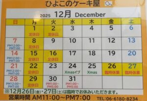 【12月カレンダー】 通常営業時間:AM11:00~PM7:00 毎週日曜日は時短営業:AM12:00~PM7:00 臨時休業:12月26日(金)・27(土) ※12月30日(火) ・31(水) は PM1:00~PM5:00までの営業となります ※12月のデコレーションケーキお渡し日は、ご予約できる日が限られていますのでご相談ください。