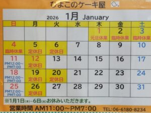 12月・1月カレンダー【12月カレンダー】 通常営業時間:AM11:00~PM7:00 毎週日曜日は時短営業:AM12:00~PM7:00 臨時休業:12月26日(金)・27(土) ※12月30日(火) ・31(水) は PM1:00~PM5:00までの営業となります ※12月のデコレーションケーキお渡し日は、ご予約できる日が限られていますのでご相談ください。
